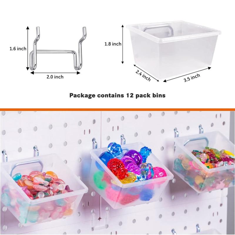 - [Multifunctional Storage Box]These pegboard boxes are perfect for keeping your small parts organized, durable storage box is easier to install or remove, with steel hook and loop, more beautiful, rounded corner design will protect your Hands are protected from harm. Also meet craft organizers, organizers, hand tools or other small parts to keep your space clean, tidy and organized. [Perfect for a Better Storage Box]The pegboard accessory box is made of high-density material, and the hooks and hoop are made of high-quality thickened steel, which is strong and durable with a rust-proof coating. 12 chopping board organizers measuring 3.9(L) x 3.9(W) x 1.9(H) cm. The pegboard clear bins can be compactly arranged for huge space saving needs, easy access to a variety of small hardware and no more clutter. [Suitable for Most Board Walls]These pegboard boxes are universal in size and fit most standard size pegboards, including 0.64cm, 0.64cm and 0.32cm thick or smaller, with a hole diameter of 0.64cm or less, compatible with metal and Non-metallic pegboard. The pegboard box set takes full advantage of the entire pegboard and creates more storage space. [Perfect for Kitchen Organizer]Perfect for organizing pliers, drills, pencils, paintbrushes, wrenches, screws, nuts, bolts, nails, clips and other arts and crafts accessories. Redesign your organization and hang everything on your organizer and storage box. Can be used in workshops, retail store shelves, garage work benches, pantries, coffer boards, walls, craft tables, hobbyists - storage solutions for small business owners. [NEW MINIMAL DESIGN]This clean pegboard trash can maximize your pegboard wall display, with odd numbers and terminals within easy reach, keeping your space clean and organized. It is fashionable to match with small pegboards of different colors. A great choice for men's tools.