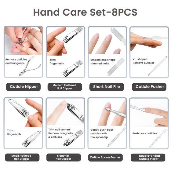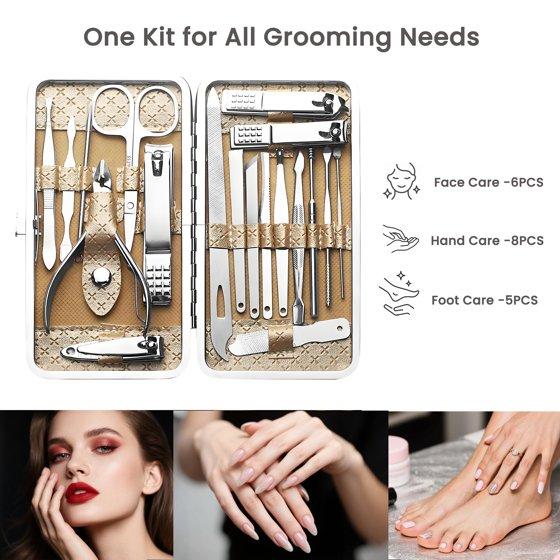 - Face, hand & foot grooming kit: 19 PCS ALL-IN-ONE Comprehensive care for NAILS, FEET, FACE—everything you need. Includes clippers, tweezers, cuticle cutters, even nose scissors. Skip buying tools separately—save time + money. Cuts thick nails EASY, no struggle