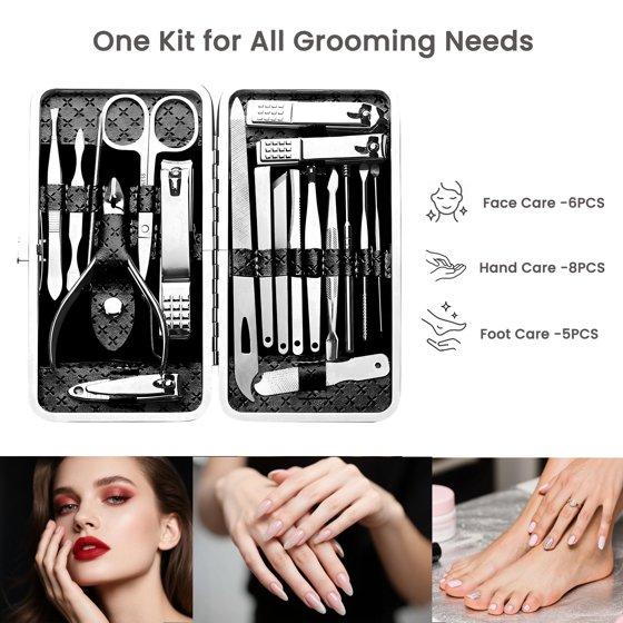 - Face, hand & foot grooming kit: 19 PCS ALL-IN-ONE Comprehensive care for NAILS, FEET, FACE—everything you need. Includes clippers, tweezers, cuticle cutters, even nose scissors. Skip buying tools separately—save time + money. Cuts thick nails EASY, no struggle