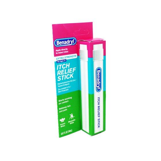Benadryl Extra Strength Itch Relief Stick provides fast, cooling relief from skin pain and itching. Made with 2% diphenhydramine HCI topical analgesic and 0.1% zinc acetate skin protectant, it begins to work on contact to temporarily relieve the pain and itching associated with most outdoor itches including insect bites, sunburn, scrapes, and minor skin irritations, burns, and cuts. This topical analgesic soothes rashes caused by poison ivy, poison oak, and poison sumac. The easy-to-use bug bite itch relief stick can be applied directly to insect and mosquito bites and is intended for ages two and up.