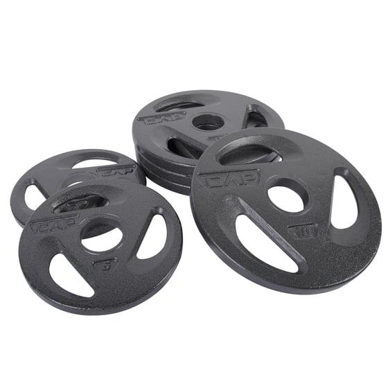 The CAP Barbell 50 lbs. Olympic Grip Plate Set includes FOUR 10-pound and TWO 5-pound cast iron weight plates with a 2-inch center hole. These weights are designed to be durable and provide long-lasting performance. Built to last, these Olympic weights are crafted from cast-iron and coated with a durable baked enamel finish. The coating adds a layer of protection to help prevent the weight plates from rusting. Featuring three grip holes, these weights are easy to load and unload. Use these weights on a bar or by themselves to increases resistance during training. Includes a 30-day limited manufacturer’s warranty. Two configurations available: pair of 25 lb. weights, or four 10 lb. weights and two 5 lb. weights.
