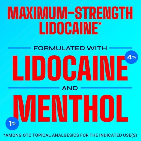 - ACTIVE INGREDIENT: Formulated with pain-relieving ingredients menthol 1% and maximum-strength lidocaine 4%* *Among OTC topical analgesics for the indicated use(s)