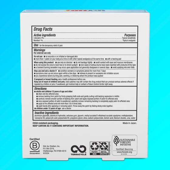 Make a comeback from pain with Icy Hot Lidocaine Pain Relief Patches. Each pack includes 5 patches formulated with pain-relieving ingredients menthol 1% and maximum strength* lidocaine 4% to target and numb aggravated nerves and reduce pain signals for temporary relief. The fast-acting patch starts working instantly for temporary relief of minor pain, including backaches, lower back, neck, shoulder, knee, elbow, ankle and leg pain; and pain from strains, sprains and bruises. Each patch is made of comfortable fabric and is easy to apply and remove from your skin. Keep Icy Hot Lidocaine Patches in your gym, work, or travel bag to deliver powerful pain relief on the go. *Among OTC topical analgesics for the indicated use(s)