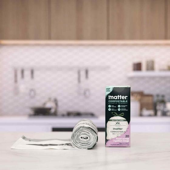 Keep your home clean and sustainable with Matter Compostable 3 Gallon Drawstring Food Scrap Bags, built with the strength needed for everyday household waste and composting. These 3 gallon bags are designed for smaller spaces such as countertop compost bins, bathroom wastebaskets, and compact trash cans, offering convenient and effective waste collection throughout your home. Each bag is made from plant based, renewable materials that support simple, eco friendly disposal without relying on traditional plastic. Matter Bags are BPI Industrial, TUV Industrial, TUV Home certified, and when disposed of properly, will fully compost within 12 months, unlike conventional plastic, which can take hundreds or even thousands of years. Featuring durable construction and easy to use drawstring handles, these composting bags make tying, carrying, and disposal quick and efficient. Ideal for food scraps, coffee grounds, and other small household waste, these compostable trash bags help reduce environmental impact while keeping your space tidy. Choose compostable bags that help you care for your home and the environment in one meaningful step that Matters.