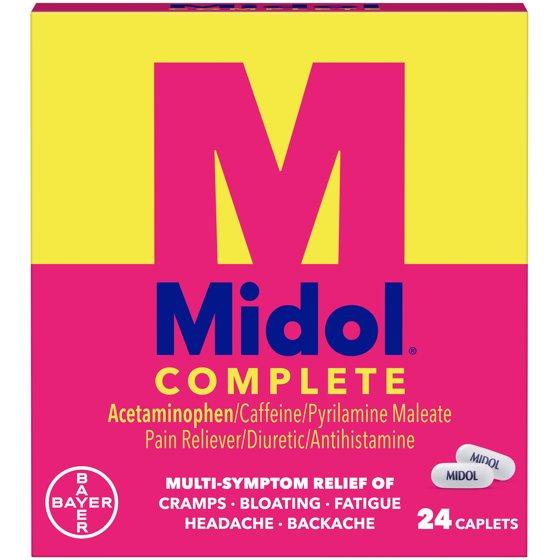 Midol Complete Menstrual Pain Relief Caplets with Acetaminophen for Menstrual Symptom Relief provide up to six hours of PMS and period cramps relief to help you feel better and stay active during and right before your menstrual cycle. Available in convenient and easy to take caplets, Midol Complete contains acetaminophen with caffeine and pyrilamine maleate, combining a pain reliever, diuretic and antihistamine to effectively relieve period cramps, headache, backache, muscle ache, bloating, fatigue and water weight gain. These powerful menstrual cramp relief caplets are recommended for adults and children 12 years and older. Use as directed. Take two caplets with water and repeat every six hours as needed, but don't take more than six caplets a day.