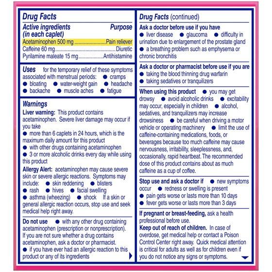 Active Ingredients: In Each Caplet: Acetaminophen (500 mg), Caffeine (60 mg), Pyrilamine Maleate (15 mg). Purpose: Pain Reliever, Diuretic, Antihistamine. Inactive Ingredients: Carnauba Wax, Croscarmellose Sodium, FD&C Blue 2 Aluminum Lake, Hypromellose, Magnesium Stearate, Microcrystalline Cellulose, Pregelatinized Starch, Propylene Glycol, Shellac, Titanium Dioxide, Triacetin.