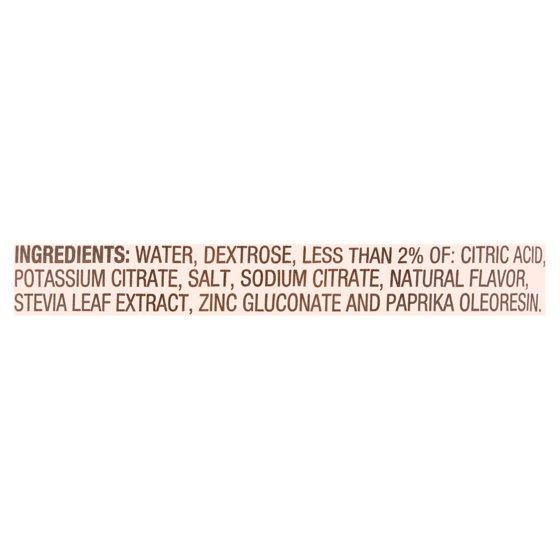 Water, Dextrose, Less Than 2% Of: Citric Acid, Potassium Citrate, Salt, Sodium Citrate, Natural Flavor, Stevia Leaf Extract, Zinc Gluconate And Paprika Oleoresin.