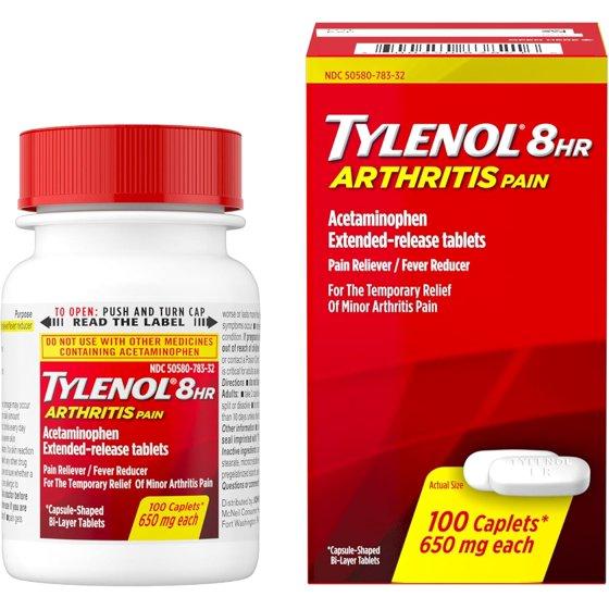 Tylenol 8 Hour Arthritis Pain Extended Release Caplets are designed to provide long-lasting relief from minor arthritis pain. Each caplet contains 650 mg of acetaminophen and features a bi-layer design—one layer for fast release, the other for extended relief lasting up to 8 hours. With 100 caplets per bottle, this product offers a convenient way to temporarily relieve minor aches and pains associated with arthritis, so you can stay comfortable throughout your day.