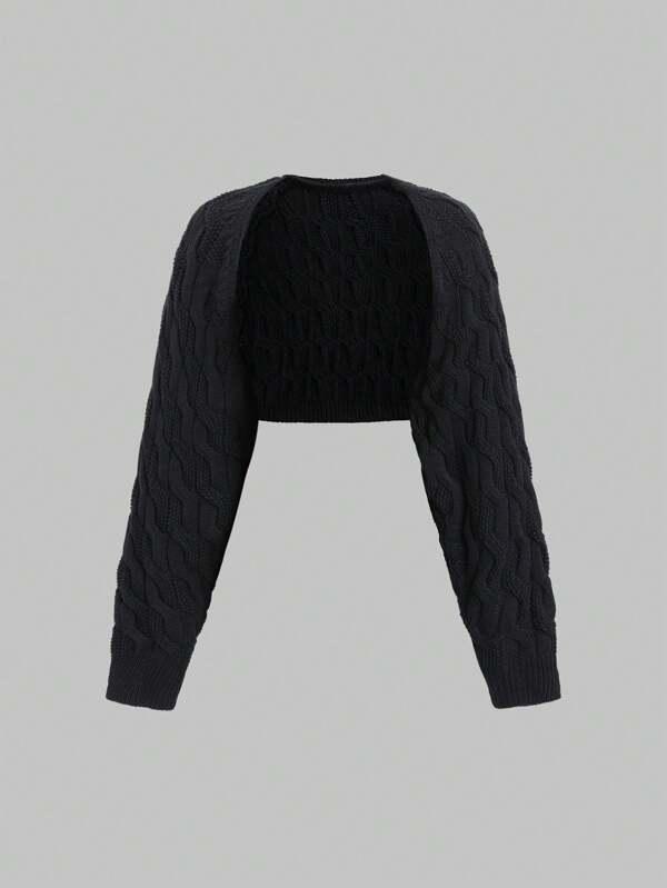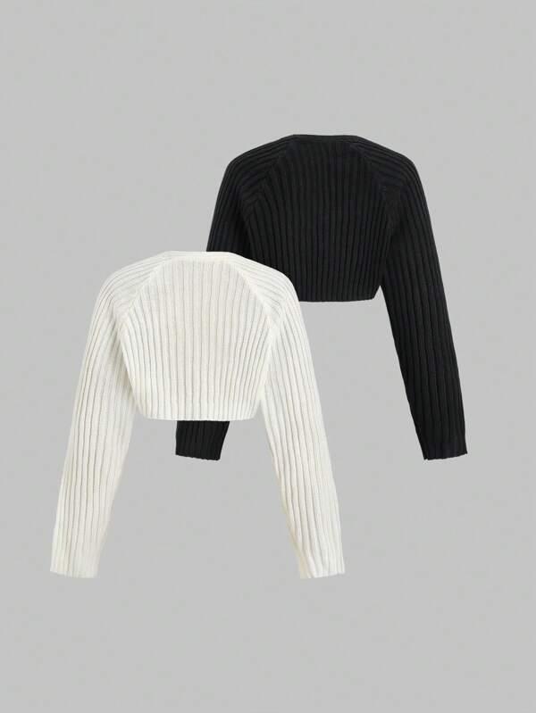 2pcs Solid Ribbed Knit Shrug Cardigan,Long Sleeve Tops