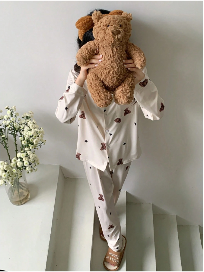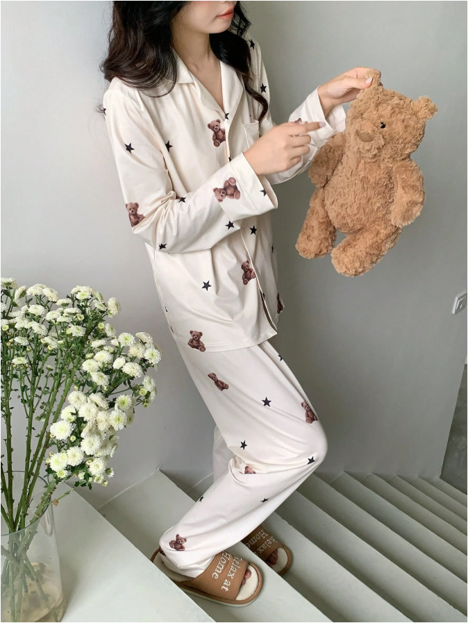2pcs/Set Elegant & Graceful Teen GirlBear & Star Pattern Long Sleeve Top And Pants Pajama Set Star Print Pajamas Sleepwear For Women Bear Print Pajamas Pajama Set Teen