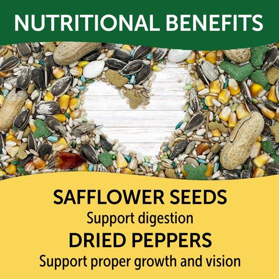 Corn, Sunflower Seed, Safflower Seed, Oat Groats, Millet, Canary Grass Seed, Peanuts, Dried Peppers, Pumpkin Seed, Ground Corn, Ground Wheat, Ground Oat Groats, Soybean Meal, Dicalcium Phosphate, Brewers Dried Yeast, Calcium Carbonate, Dried Cane Molasses, Soybean Oil, Dried Egg Product, Flaxseed Meal, Salt, L-Lysine Monohydrochloride, DL-Methionine, Vitamin E Supplement, Iron Proteinate, Manganese Proteinate, Stabilized Rice Bran, Ascorbic Acid (Vitamin C), Niacin, Vitamin A Supplement, Fish Oil, Sodium Selenite, Riboflavin Supplement, Pyridoxine Hydrochloride, Thiamine Mononitrate, Menadione Sodium Bisulfite Complex (Source of Vitamin K Activity), Biotin Supplement, Dried Lactobacillus Acidophilus Fermentation Product, Dried Lactobacillus Casei Fermentation Product, Dried Bifidobacterium Thermophilum Fermentation Product, Dried Enterococcus Fermentation Product, Copper Proteinate, Folic Acid, Vitamin B-12 Supplement, Rubbed Sage, Zinc Proteinate, Cobalt Proteinate, Calcium Iodate, Citric Acid (A Preservative), Lecithin, Rosemary Extract, Added FD&C Colors (Red #3, Red #40, Yellow #5, Blue #1, Titanium Dioxide), Artificial Flavor.