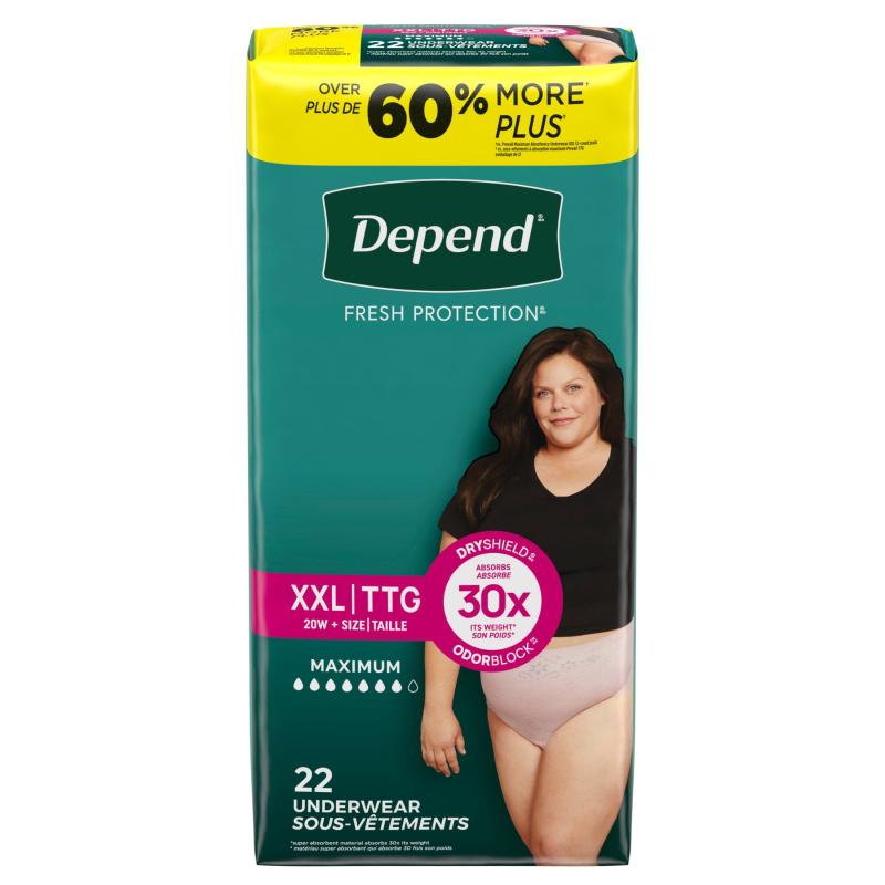 - DEPEND FRESH PROTECTION: 22 count of Depend Fresh Protection Adult Incontinence & Postpartum Bladder Leak Underwear for Women, size extra-extra-large (55–64" waist)