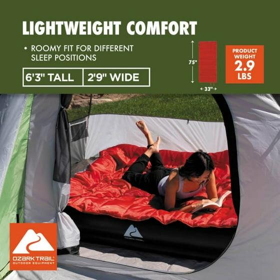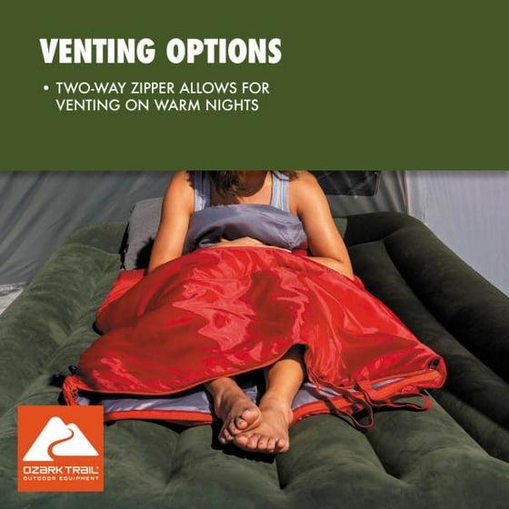 The Ozark Trail 50 Degree Warm Weather Sleeping Bag is a perfect choice for the outdoor newbie, the car camper, a sleepover or any adventure in warm weather with just enough insulation to keep you comfortable. This sleeping bag is made from partially recycled polyester fabrics that feel good against the skin and that you can feel good about! The full-length zipper with patent pending ZIP SHIELD zipper pull makes getting in and out of the bag a breeze and allows the bag to open fully for use as a quilt or an extra layer. When you want to pack up in a hurry use the quick-roll elastic straps to bundle and go. This sleeping bag includes a stuff sack for carrying and helps to minimize storage space in your car and at home. Things can get messy when you’re in the great outdoors, but don’t fret, this sleeping bag is machine washable so it’s easy to ensure your bag is ready for the next adventure. Whether you're taking the family on an extended camping trip in the mountains or taking a day trip to a local hiking trail, Ozark Trail has everything you need to enjoy the great outdoors. Browse all our gear like spacious tents, durable backpacks, warm sleeping bags, outdoor cooking supplies, and more.