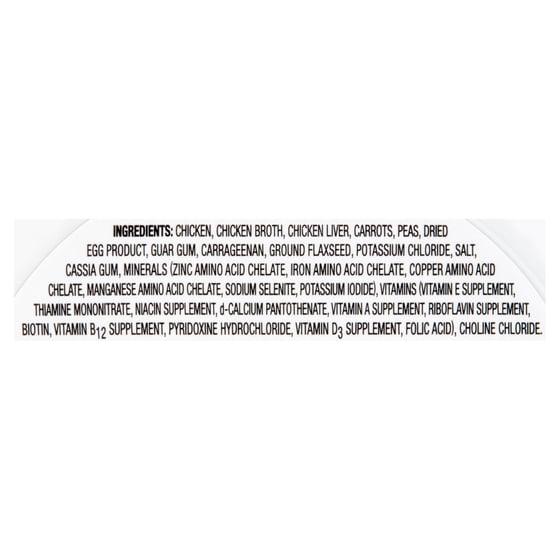CHICKEN, CHICKEN BROTH, CHICKEN LIVER, CARROTS, PEAS, CHICKEN HEART, GUAR GUM, DRIED EGG PRODUCT, CARRAGEENAN, FISH OIL (PRESERVED WITH MIXED TOCOPHEROLS), GROUND FLAXSEED, SALT, CASSIA GUM, POTASSIUM CHLORIDE, MINERALS (ZINC PROTEINATE, IRON PROTEINATE, COBALT PROTEINATE, COPPER PROTEINATE, MANGANESE PROTEINATE, SODIUM SELENITE, POTASSIUM IODIDE), VITAMINS (VITAMIN E SUPPLEMENT, THIAMINE MONONITRATE, NIACIN SUPPLEMENT, d-CALCIUM PANTOTHENATE, VITAMIN A SUPPLEMENT, PYRIDOXINE HYDROCHLORIDE, RIBOFLAVIN SUPPLEMENT, BIOTIN, VITAMIN B12 SUPPLEMENT, VITAMIN D3 SUPPLEMENT, FOLIC ACID), CHOLINE CHLORIDE, MAGNESIUM SULFATE.