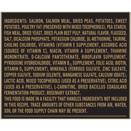 SALMON, SALMON MEAL, DRIED PEAS, POTATOES, SWEET POTATOES, POULTRY FAT (PRESERVED WITH MIXED TOCOPHEROLS), PEA STARCH, FISH MEAL, DRIED YEAST, DRIED PLAIN BEET PULP, NATURAL FLAVOR, FLAXSEED, SALT, DICALCIUM PHOSPHATE, POTASSIUM CHLORIDE, DL-METHIONINE, TAURINE, CHOLINE CHLORIDE, VITAMINS (VITAMIN E SUPPLEMENT, ASCORBIC ACID [SOURCE OF VITAMIN C], NIACIN, VITAMIN A SUPPLEMENT, THIAMINE MONONITRATE, D-CALCIUM PANTOTHENATE, RIBOFLAVIN SUPPLEMENT, PYRIDOXINE HYDROCHLORIDE, VITAMIN B₁₂ SUPPLEMENT, FOLIC ACID, BIOTIN, VITAMIN D₃ SUPPLEMENT), MINERALS (FERROUS SULFATE, ZINC SULFATE, COPPER SULFATE, SODIUM SELENITE, MANGANESE SULFATE, CALCIUM IODATE), LACTIC ACID, MIXED TOCOPHEROLS (USED AS A PRESERVATIVE), CITRIC ACID (USED AS A PRESERVATIVE), L-CARNITINE, DRIED BACILLUS COAGULANS FERMENTATION PRODUCT, ROSEMARY EXTRACT. NOTE: THIS FOOD IS MADE IN A FACILITY THAT HANDLES INGREDIENTS NOT INCLUDED IN THIS RECIPE. TRACE AMOUNTS OF OTHER SUBSTANCES FROM AIR, WATER, SOIL, OR THE FOOD SUPPLY CHAIN MAY BE PRESENT.