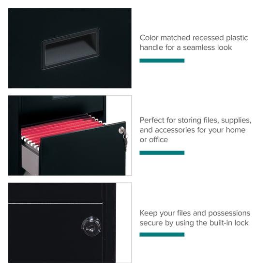 The Two Drawer Metal Vertical File Cabinet is designed for smaller professional offices or home office use. The cabinet features durable steel construction and a smart, efficient design that works well in small spaces, fitting easily under most work surfaces or office desks. Each drawer features high-sides to accommodate letter-sized hanging files. The drawers are also a perfect storage solution for other office essentials. Using a patented glide suspension, the drawer slides open and close smoothly with a three-quarter drawer extension to prevent tipping. In addition, you can keep your files and possessions secure with its locking drawers. The painted steel surface is non-porous and easy to clean. Bring storage and organization to your home or office with this stylish two-drawer file cabinet. Your office supplies and files will always be organized and within reach. Color: Black