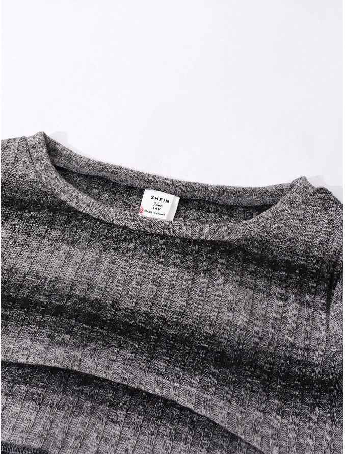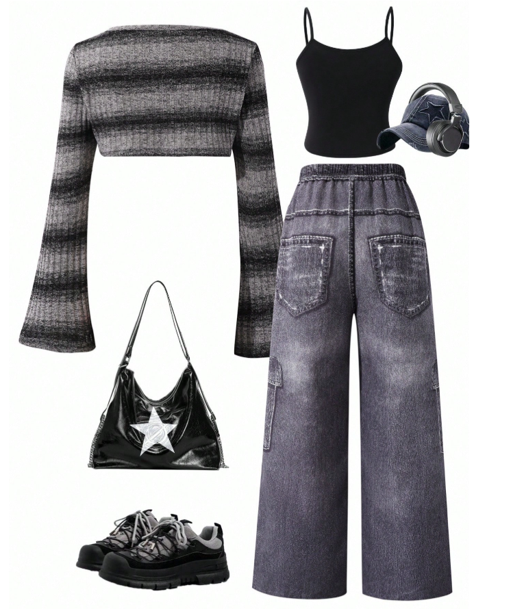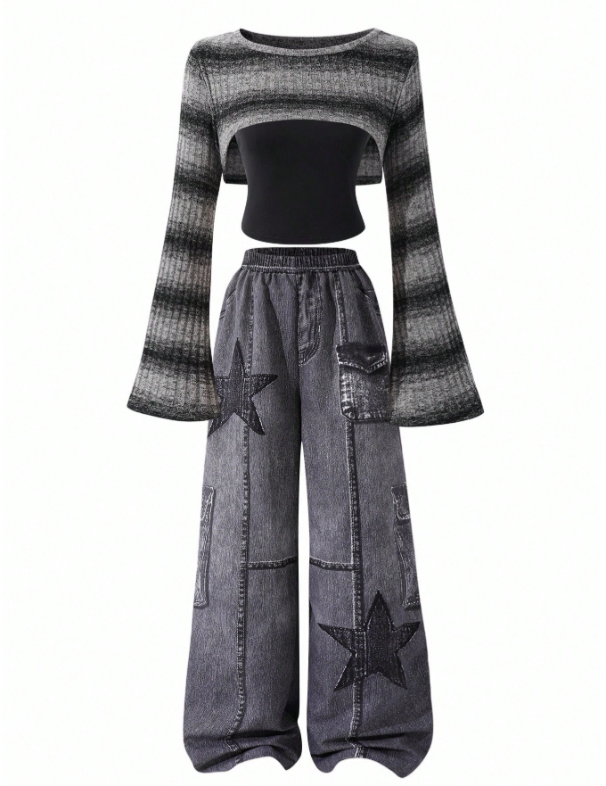 3pcs/Set Teenage Girls Ombre Striped Flare Sleeve Cover Up, Solid Color Camisole, And Distressed Star Print Wide Leg Jeans Pants, Retro Chic Street Style