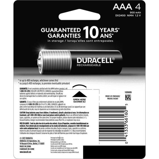 - GUARANTEED FOR 10 YEARS IN STORAGE: Duracell guarantees each Pre-Charged NiMH AAA battery to last 10 years in storage, or 400 charges, whichever comes first, and they will hold a charge for up to 1 year when not in use. You can be confident these batteries will be ready when you need them.
