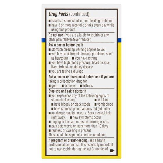 Active Ingredients: Aspirin (81 mg) (NSAID). Inactive Ingredients: Black Iron Oxide, Colloidal Silicon Dioxide, Corn Starch, D&C Yellow 10 Aluminum Lake, FD&C Yellow 6 Aluminum Lake, Hypromellose, Microcrystalline Cellulose, Polydextrose, Polyethylene Glycol, Polyvinyl Acetate Phthalate, Propylene Glycol, Shellac Wax, Sodium Alginate, Sodium Bicarbonate, Stearic Acid, Talc, Titanium Dioxide, Triacetin, Triethyl Citrate.