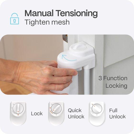 - PRODUCT DETAILS: Extending up to 71" wide and 33" tall this hardware mounted Retractable Baby Gate includes all components for easy installation.