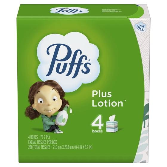 - Pack includes 4 Mega Cubes (72 Tissues Per Cube) of Puffs Plus Lotion Facial Tissues