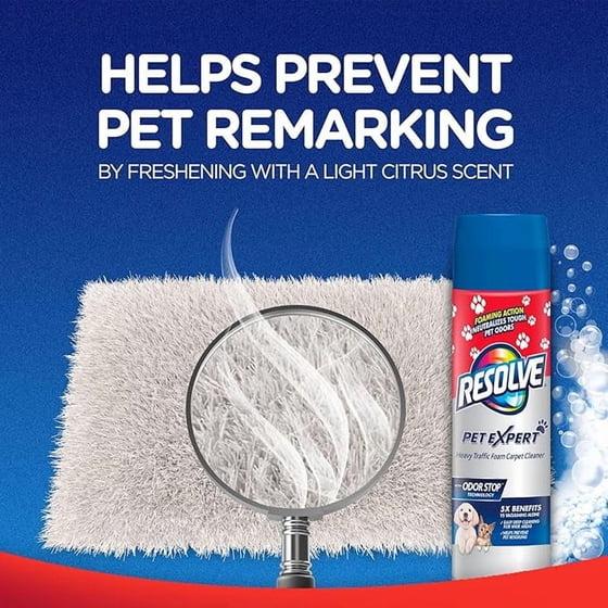 Before Cleaning: Vacuum carpet thoroughly to remove loose dirt. Test a small, hidden area for colorfastness and examine when dry. If color is affected do not use. For upholstery, look for manufacturer's cleanability code tag. Use on fabrics coded "WS" or "W". If coded "X" or "S", do not use. Not recommended for use on velvet, silk, vinyl, or leather. Do not use Resolve Easy Clean Pro on any surface other than carpets. Do not spray directly on pets. Directions: Large Area Carpet Cleaning: 1. Shake can well. Hold can upside down about 2 feet above carpet. Spray foam evenly over a 3 foot square area. 2. Work the foam into carpet in two directions using a damp, colorfast mop. 3. Repeat steps 1 & 2 until the entire area in cleaned. 4. When dry, vacuum thoroughly to remove dried foam and loosened dirt. For Use in Resolve Easy Clean Pro Carpet Brush:. 1. Remove spray cap from Resolve High Traffic Foam 22oz. can. Shake the can vigorously before each use. If the can is already in the gadget, remove and shake again. 2. Insert can into the gadget and rotate clockwise until it gently clicks into the locked position. 3. To remove the can, rotate counterclockwise into the unlocked position and gently pull upwards. 4. Pull trigger to dispense foam, then brush the foam into the carpet. When dry, vacuum thoroughly to remove dried foam and loosened dirt. 5. Replace spray cap to can for standard use. Upholstery Cleaning: 1. Blot wet soils with a clean absorbent cloth. 2. Shake Can Well and generously apply directly to stain from a distance pf 46 inches. Allow foam to absorb into stain for 3 minutes. 3. Gently blot area with a clean, damp, colorfast sponge or cloth. Rub gently if required. Do not overwet fabrics. Hint: To avoid rings, clean entire section where soil occurs. 4. Rinse sponge or cloth and repeat as necessary. Allow fabric to dry thoroughly before use. 5. Only use spray cap to dispense foam for upholstery cleaning. To ensure complete dispensing during life of product, tilt can downwards at approximately 60° while spraying. Contents will clean a carpeted area of 168 square feet (12' x 14'). If accidentally sprayed on wood furniture, just wipe off. For best results: Use vacuum cleaner with a fresh, empty bag.