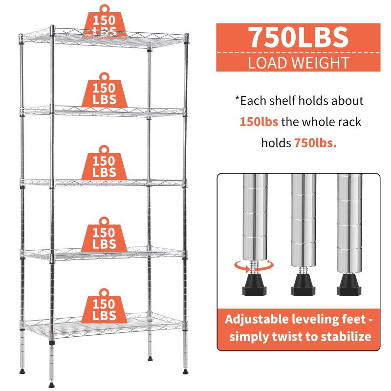 - Each layer shelf can hold 150lbs (evenly distributed), maximum load capacity is 750lbs.