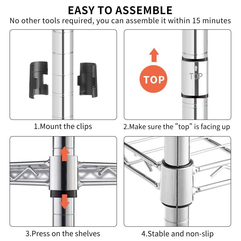 - 👍【Easy to Install】The wire shelves structure is very simple, no tools required to assemble it. The package includes all parts and detailed instruction. If you have any problem with our metal shelf, please feel free to contact us, we will give you a satisfactory solution.
