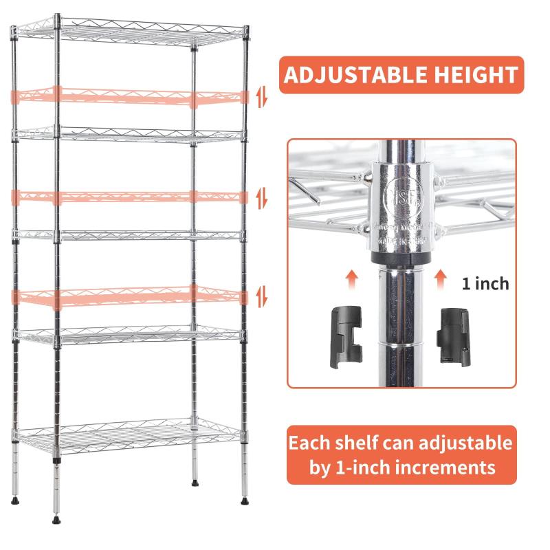 - 👍【Adjustable Design】Each shelf can be adjustable in 1-inch increments, adjust the shelf height according to size of the item, can be assemble into 5-tier shelf or 4-tier shelf, meet your different needs, enjoy DIY fun. Adjustable feet can perfectly fits uneven ground, Anti-slip and prevent scratching the ground.