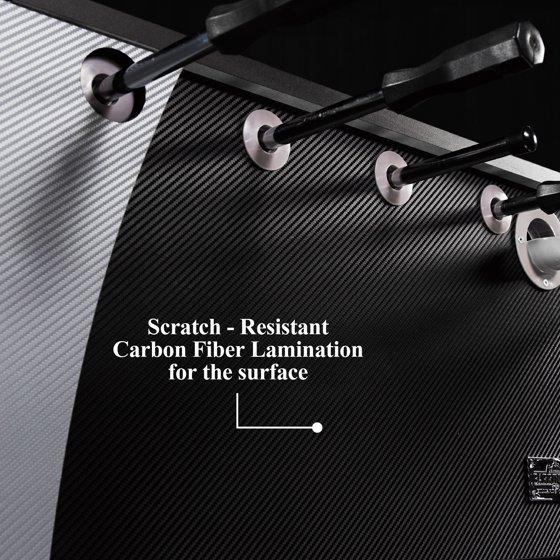 - CRAFTMANSHIP: The foosball table is made of MDF and has a scratch-resistant PVC laminated carbon fiber finish. Goal boxes return your tabletop soccer ball after each goal and the score is tracked with traditional bead style scorers.