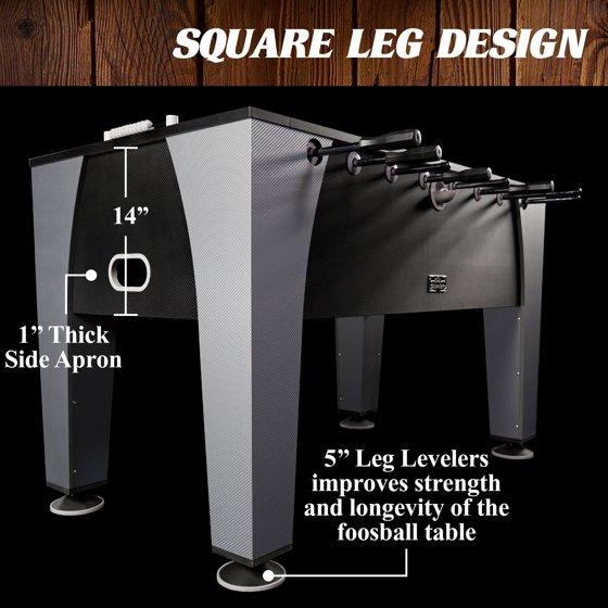 - STABLE LEG DESIGN: The legs of this soccer table are made of MDF and are PVC laminated with a light gray carbon fiber finish to create a modern design style perfect for game rooms and have adjustable 5” leg levelers to help even the playing surface.