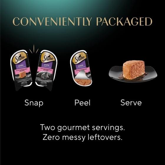 - Contains (6) 2.6 oz. SHEBA PERFECT PORTIONS twin pack trays (12 servings total) of SHEBA Wet Cat Food Paté, With Sustainable Salmon.