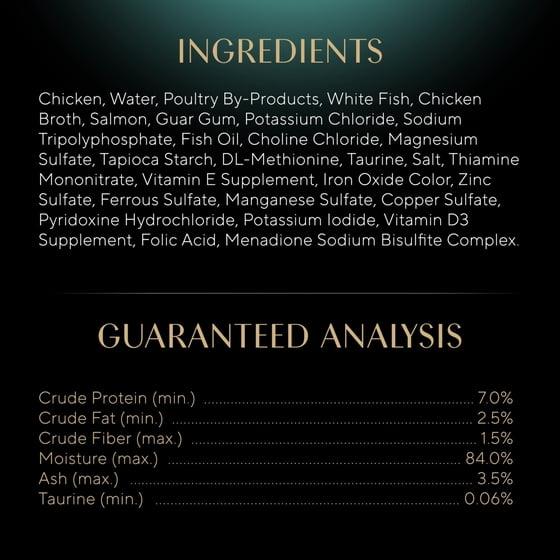 Chicken, Water, Poultry By-Products, White Fish, Chicken Broth, Salmon, Guar Gum, Potassium Chloride, Sodium Tripolyphosphate, Fish Oil, Calcium Carbonate, Choline Chloride, Magnesium Sulfate, Tapioca Starch, DL-Methionine, Taurine, Salt, Thiamine Mononitrate, Vitamin E Supplement, Iron Oxide Color, Zinc Sulfate, Ferrous Sulfate, Manganese Sulfate, Copper Sulfate, Pyridoxine Hydrochloride, Potassium Iodide, Vitamin D3 Supplement, Folic Acid, Menadione Sodium Bisulfite Complex.