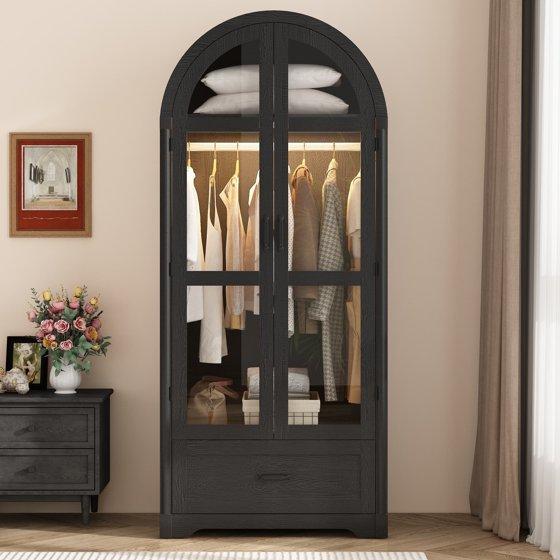 - Arched Wardrobe with 2 Glass Doors & 1 Drawer, Prefect Bedroom Armoire Clothes Organizer.
