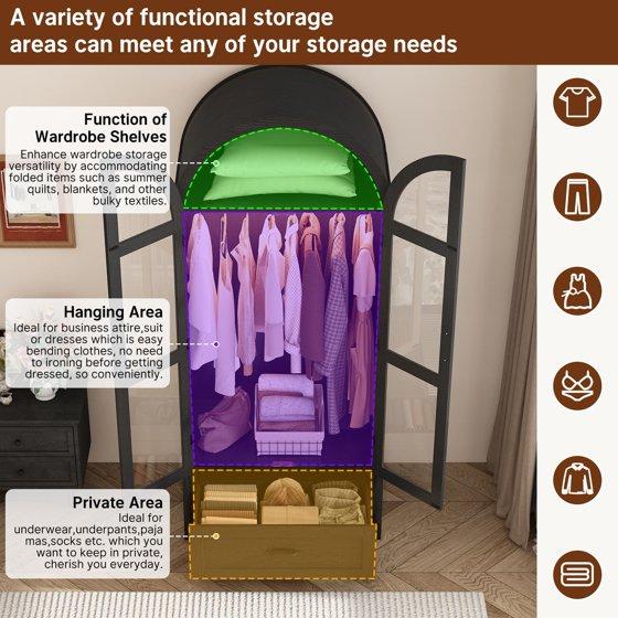 - Large Capacity Wardrobe: This arched wardrobe measures 19.7"D x 30.6"W x 71"H, providing ample storage space. Equipped with two doors, 1 storage drawer and an interior divider, it can be used to store clothes, blankets and organize small items such as socks, underwear, etc. The wood wardrobes with hanging rod are perfect for storing longer clothes, effectively preventing them from wrinkling.