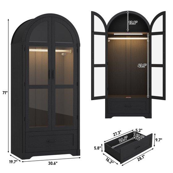 71"H Arched Armoire Wardrobe Closet for Bedroom w/ Glass Door & LED Sensor Light, Wooden Wardrobe Closet Clothing Storage Cabinet w/1 Drawer & Hanging Rod