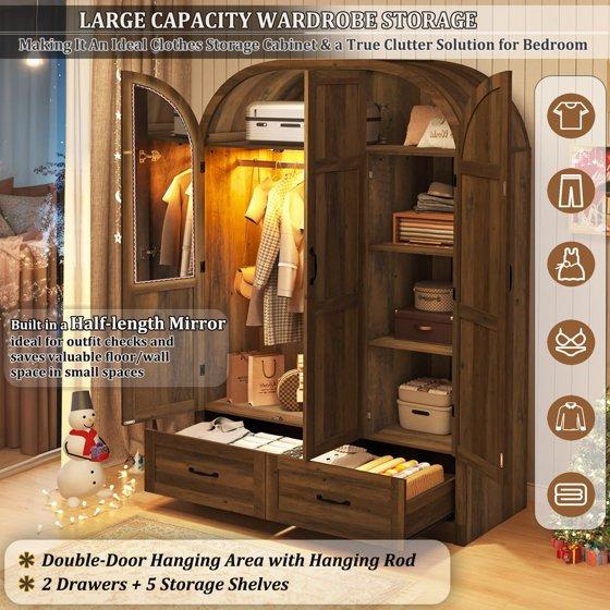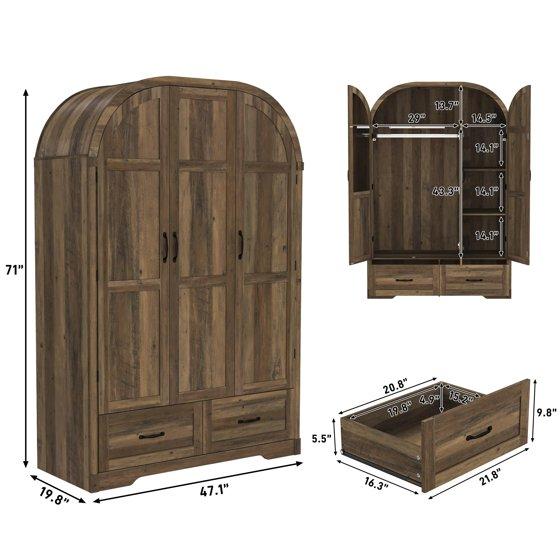 - 1. Elegant Arched Design & Spacious 71" Vertical Storage - Elevate your bedroom aesthetics with our unique arched top silhouette, blending modern sophistication with classic charm. This 47.1" wide 3-door wardrobe maximizes vertical space, providing a high-capacity storage solution that fits perfectly in bedrooms, walk-in closets, or guest rooms.