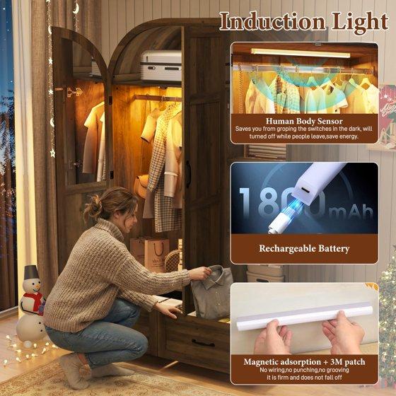 - 2. Intelligent LED Motion Sensor Light - No more searching in the dark! This smart armoire features an integrated LED motion sensor light that automatically illuminates when the doors open. It provides a clear view of your entire wardrobe, making outfit selection effortless and adding a touch of luxury to your daily routine.