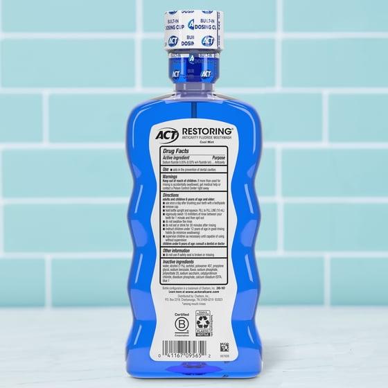 - Contains: One (1) 33.8-fluid-ounce bottle of ACT Restoring Anticavity Fluoride Mouthwash, Cool Mint