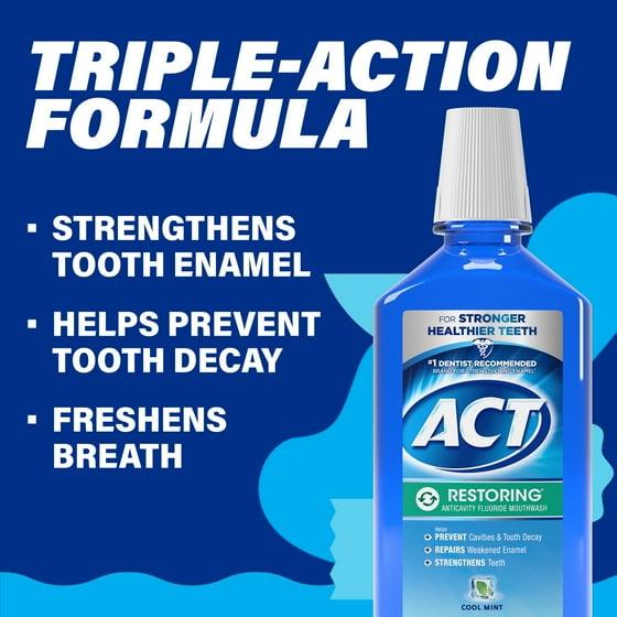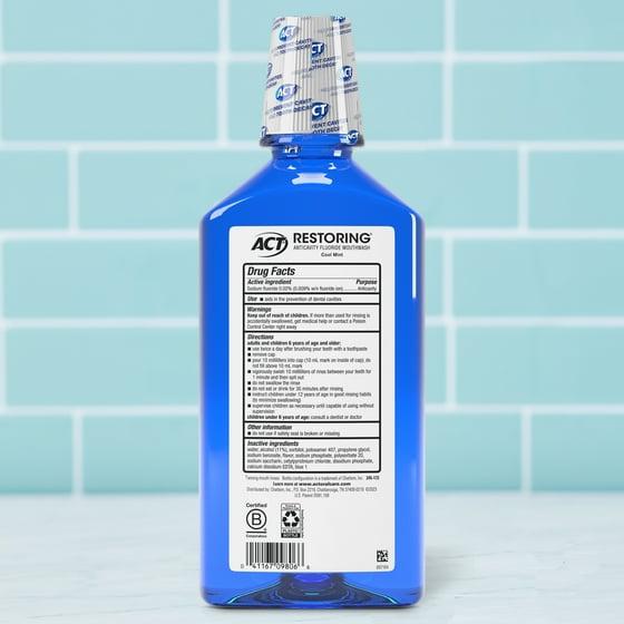 - Contains: One (1) 33.8-fluid-ounce bottle of ACT Restoring Anticavity Fluoride Mouthwash, Cool Mint