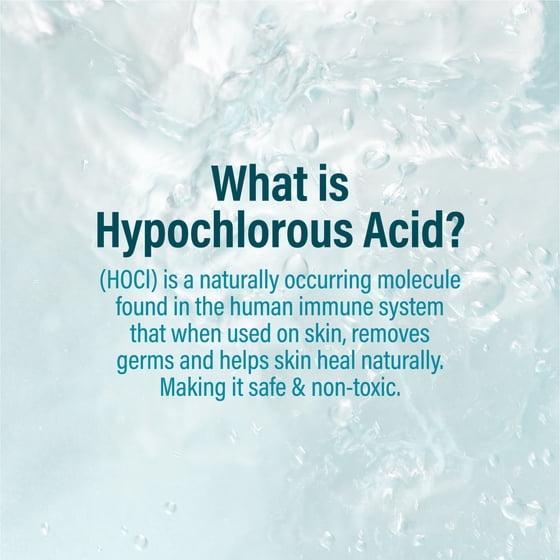 - HYPOCHLOROUS ACID: (HOCl) is a naturally occurring molecule found in the human immune system that when used on skin, it removes germs and helps skin heal naturally. Making it safe & non-toxic