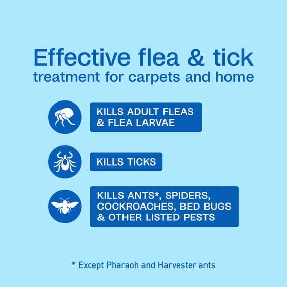 - FLEA & TICK CARPET & HOME SPRAY: Carpet flea spray that kills adult fleas, flea larvae, ticks, ants (except Pharaoh and Harvester ants), spiders, cockroaches, bed bugs and other listed pests. It kills fleas and bed bugs within 5 minutes.