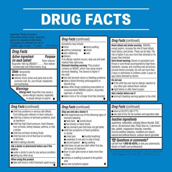 Nothing fights fever faster or longer(1) than Advil Junior Strength pain reliever and fever reducer. In just one dose, these kids ibuprofen chewables reduce fever and relieve minor aches and pains due to the common cold, headache or teething. Formulated for children ages 2 to 11 years, each junior strength Advil tablet contains ibuprofen 100mg, a pain medication that also controls fever. Just one dose of this children's ibuprofen pain relief medicine lasts up to eight hours, meaning few doses for your child throughout the day. Advil chewable kids pain medicine tablets are portable and easy for kids to take, no dosing cup or water needed. The medicine in this childrens ibuprofen chewable is the #1 pediatrician-recommended active ingredient in a fever reducer/pain reliever. Conquer the back to school season with Advil, your ultimate ally against the common cold! (1) Among non-prescription analgesics
