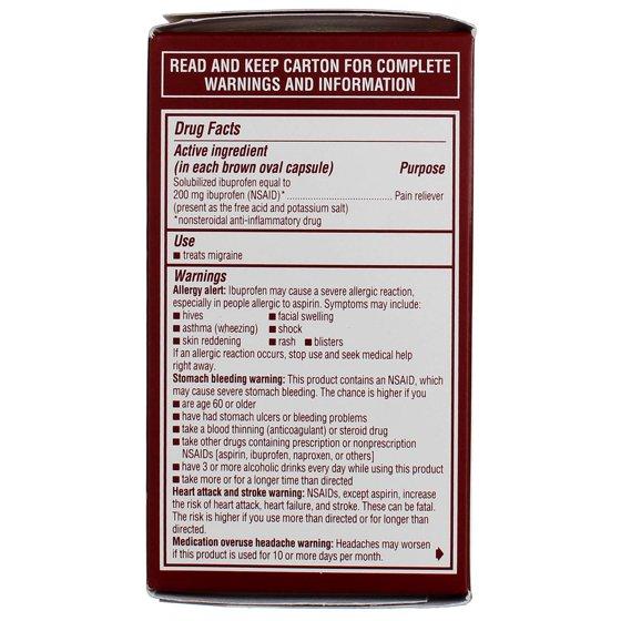 - Heading Purpose Pain Reliever Manufacturer Pfizer Active Ingredients 1 Capsule: Solubilized Ibuprofen (NSAID [Nonsteroidal Anti-Inflammatory Drug]) Directions Do not take more than directed. The smallest effective dose should be used. Adults: Take 2 capsules with a glass of water. If symptoms persist or worsen, ask your doctor. Do not take more than 2 capsules in 24 hours, unless directed by a doctor. Under 18 years of age: Ask a doctor. Other Information: Each capsule contains: potassium 20 mg. Read all directions and warnings before use. Keep carton. Store at 20-25 degrees C (68-77 degrees F). Avoid excessive heat above 40 degrees C (104 degrees F). Inactive Ingredients Click here for more info D&C Yellow No. 10; FD&C Green No. 3; FD&C Red No. 40; Gelatin; Light Mineral Oil; Pharmaceutical Ink; Polyethylene Glycol; Potassium Hydroxide; Purified Water; Sorbitan; Sorbitol hide Uses Click here for more info Treats migraine. hide Warnings Click here for more info READ AND KEEP CARTON FOR COMPLETE WARNINGS AND INFORMATION. Allergy alert: Ibuprofen may cause a severe allergic reaction, especially in people allergic to aspirin. Symptoms may include: Hives; Facial swelling; Asthma (wheezing); Shock; Skin reddening; Rash; Blisters. If an allergic reaction occurs, stop use and seek medical help right away. Stomach bleeding warning: This product contains an NSAID, which may cause severe stomach bleeding. The chance is higher if you: Are age 60 or older; Have had stomach ulcers or bleeding problems; Take a blood thinning (anticoagulant) or steroid drug; Take other drugs containing prescription or nonprescription NSAIDs [aspirin, ibuprofen, naproxen, or others]; Have 3 or more alcoholic drinks every day while using this product; Take more or for a longer time than directed. Do not use: If you have ever had an allergic reaction to any other pain reliever/fever reducer; Right before or after heart surgery. Ask a doctor before use if: You have never had migraines diagnosed by a health professional; You have a headache that is different from your usual migraines; You have the worst headache of your life; You have fever and stiff neck; You have headaches beginning after or caused by head injury, exertion, coughing or bending; You have experienced your first headache after the age of 50; You have daily headaches; You have a migraine so severe as to require bed rest; Stomach bleeding warning applies to you; You have problems or serious side effects from taking pain relievers or fever reducers; You have a history of stomach problems, such as heartburn; You have high blood pressure, heart disease, liver cirrhosis, kidney disease, or asthma; You are taking a diuretic. Ask a doctor or pharmacist before use if you are: Under a doctor's care for any serious condition; Taking aspirin for heart attack or stroke, because ibuprofen may decrease this benefit of aspirin; Taking any other drug. When using this product: Take with food or milk if stomach upset occurs. The risk of heart attack or stroke may increase if you use more than directed or for longer than directed. Stop use and ask a doctor if: You experience any of the following signs of stomach bleeding: Feel faint; Vomit blood; Have bloody or black stools; Have stomach pain that does not get better; Migraine headache pain is not relieved or gets worse after the first dose; Any new symptoms appear. If pregnant or breast-feeding, ask a health professional before use. It is especially important not to use ibuprofen during the last 3 months of pregnancy unless definitely directed to do so by a doctor because it may cause problems in the unborn child or complications during delivery. Keep out of reach of children. In case of overdose, get medical help or