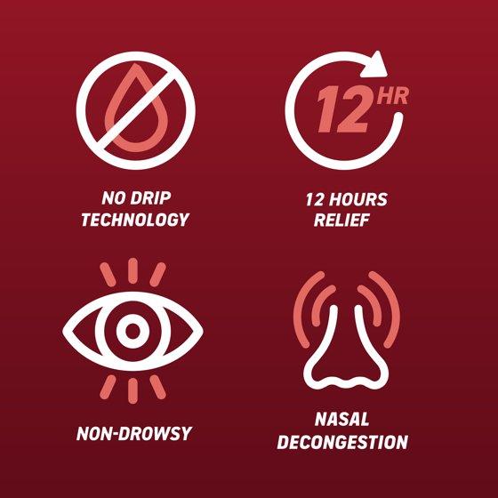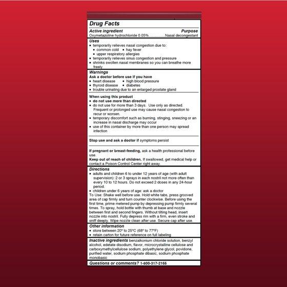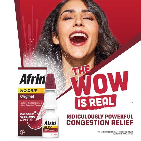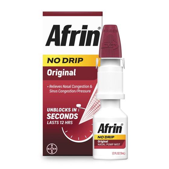 With its powerful and fast-acting formula, Afrin No Drip Original Maximum Strength targets the source of your nasal congestion to effectively alleviate symptoms such as stuffy nose, sinus pressure, and congestion caused by allergies, colds, or other respiratory illnesses. This powerful congestion medicine for adults and children 6 to under 12 years of age (with adult supervision) features a no-drip formula that helps to reduce the mess and inconvenience associated with other nasal sprays. This nasal decongestant spray provides relief in seconds and continues to work for 12 hours. Just 2 to 3 sprays in each nostril from the No Drip bottle is all it takes to shrink swollen nasal membranes and provide relief of nasal congestion due to colds or allergies.