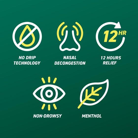 Afrin No Drip Severe Congestion Maximum Strength 12 Hour Nasal Congestion Relief Spray provides fast, powerful, medicated relief of nasal congestion from colds or allergies. Formulated with soothing menthol, this maximum strength nasal decongestant starts to work instantly and lasts all day. Featuring an easy action pump that delivers instant relief, this medicated 12 hour nasal spray allows easier breathing through the nose without unpleasant dripping down the nose or throat. For adults and children 6 to 12 years with adult supervision, two or three sprays in each nostril deliver powerful nasal and sinus congestion relief from severely irritated nasal passages.