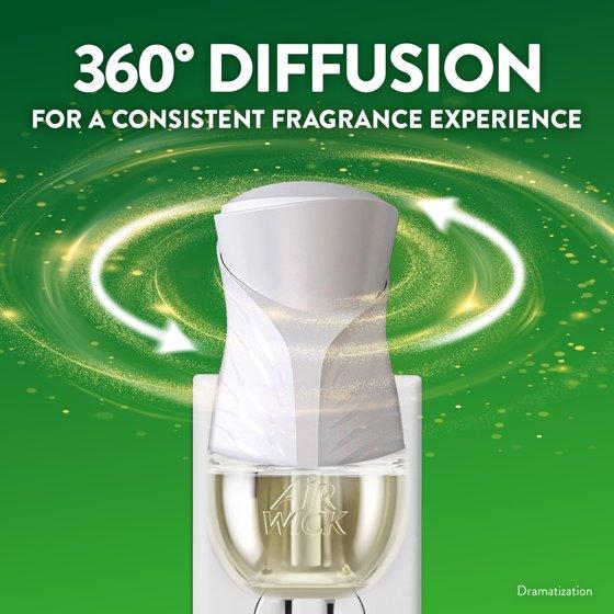 Use instructions: 1. Remove warmer from wall outlet. Remove refill from warmer and screw cap onto empty fragrance bottle. 2. Unscrew cap from new fragrance bottle and insert into warmer until “click” can be heard. 3. Plug upright into outlet. Rotate plug if needed. Unit will leak if plugged in sideways or upside down. When unplugged, keep unit upright. Operation: Read the important safety instructions. Adjust fragrance intensity by rotating dial on top of warmer. Largest mark = max setting. This is not a toy and is not intended for use by children. For adult use only. See the device package for additional safety information. Only for use with Air Wick Scented Oil Air Freshener products. Reckitt Benckiser will not be held responsible for damage, injury or poor performance caused by use of any other refills in Air Wick warmers. Do not place fragrance oil bottle or cap on finished wood surfaces or place any object within 12 inches (30 cm) above warmer. Do not use with extension cords. Do not immerse in water. Fragrance oils may collect on warmer over time. To clean, remove from electrical outlet and wipe with dry cloth. Wash hands after handling. Store warmer and refill in a dry location. Do not obstruct or block air flow from unit. Do not use in small areas without adequate ventilation.