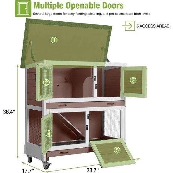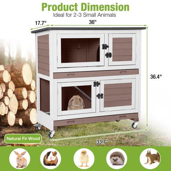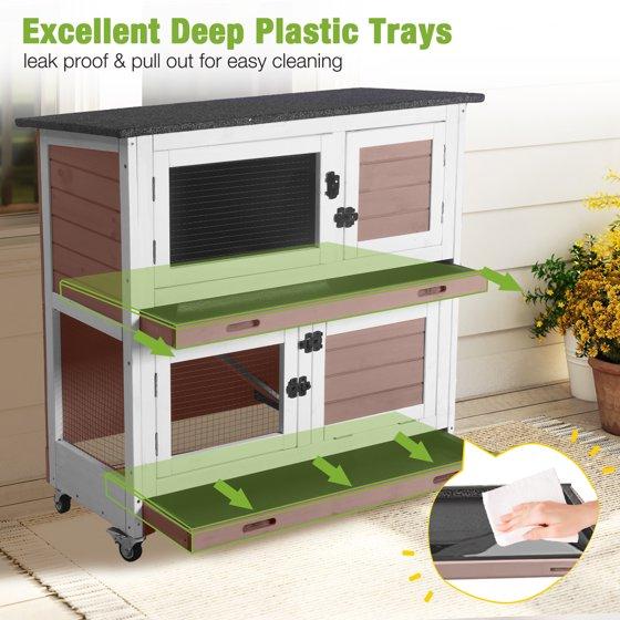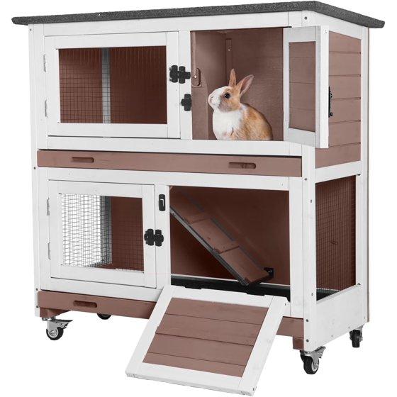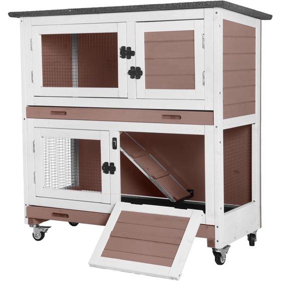 AIVITUVIN Wooden Rabbit Hutch Indoor Outdoor Rabbit Cage with Two Removable Trays Bunny Cage on Wheels Pet House Guinea Pig Cage 2 Story (Brown)