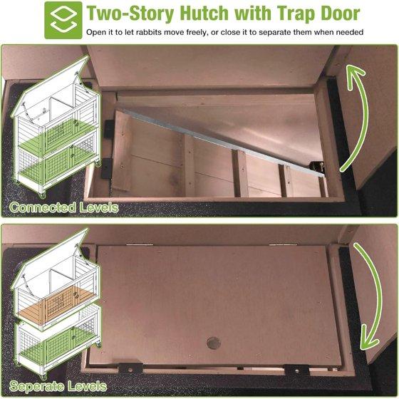 - Includes a hinged trap door to separate the upstairs and downstairs areas, offering flexibility for different pets or separate bunny care.
