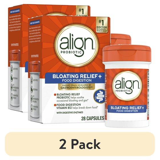 THE PROBIOTIC BRAND DOCTORS RECOMMEND MOST. Recommended by Gastroenterologists two times more than any other probiotic, Align Probiotic Bloating and Gas Relief + Food Digestion, with 28 Capsules is the #1 doctor and gastroenterologist recommended probiotic brand.^ Align Bloating Relief + Food Digestion is a daily probiotic supplement that adds good bacteria to help relieve occasional bloating.* Align Bloating Relief + Food Digestion contains the unique strain Bifidobacterium 35624 TM, which was developed by Gastroenterologists, is backed by 20+ years of research, and naturally helps soothe occasional abdominal discomfort, gas, and bloating.* It also contains vitamin B12 which supports the breakdown of fats and proteins.* Each capsule also contains a complementary, proprietary blend of 5 digestive enzymes - amylase, protease, lactase, cellulase, and lipase. Taking one capsule a day helps to maintain your digestive system's natural balance and helps support the metabolism of food.* Align Bloating Relief + Food Digestion is vegetarian, gluten-free, soy-free, dairy-free, and does not require refrigeration.*These statements have not been evaluated by the Food and Drug Administration. This product is not intended to diagnose, treat, cure, or prevent any disease. ^Among Doctors and Gastroenterologists who recommended a brand of probiotic in Pro Voice 2022 survey. Unisex